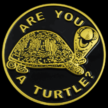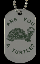 Our Are You A Turtle? Products are classy yet affordable. Each pin is 1" in height, die struck, gold plate over brass, with enamel colors. Patches are 2 7/8" in height, 100% Embroidered with Heat Seal Backing. Our car emblems are 2 3/4" 3D stamped aluminum with 3-M sticky adhesive backing. Our double sided dog tags are die struck, gold plate over brass, with enamel colors. Packaged and ready for retail, each dog tag includes full military style stainless chains keep your tag in clear view. Custom orders accepted. |