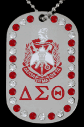 Our Greek Double Sided Bling Dog Tags combine our best selling dog tags with brilliant colored Swarovski Austrian Crystal Stones to create an eye catching piece of jewelry. Each dog tag has full color enamel details and Austrian crystal stones matching the organizations colors in highly polished silver plate over heavy brass. Full military style stainless chains keep your tag in clear view. Custom orders accepted. |
