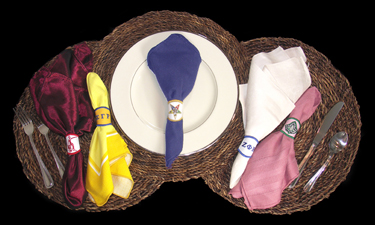 Our napkin rings give you that extra touch of class that will get you WOWS! at any dining room table or around the picnic table! A perfect formal or informal accessory. Be prepared by buying extra of all groups to put in place settings to surprise those guests who may not belong to your organization. Imagine the surprise of everyone when they go to their seat and you already have their "membership ring" at their place at the table! Now YOU are the hostess with the mostest!!! They are so inexpensive, consider making them "party" or "parting" gifts to send home with your guests. They are completely washable. In addition, next time you pull out that favorite scarf or bandana....slip one of these on for an added fashion statement!